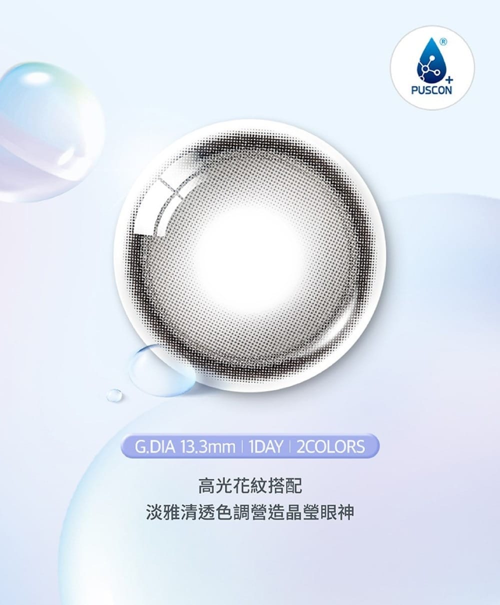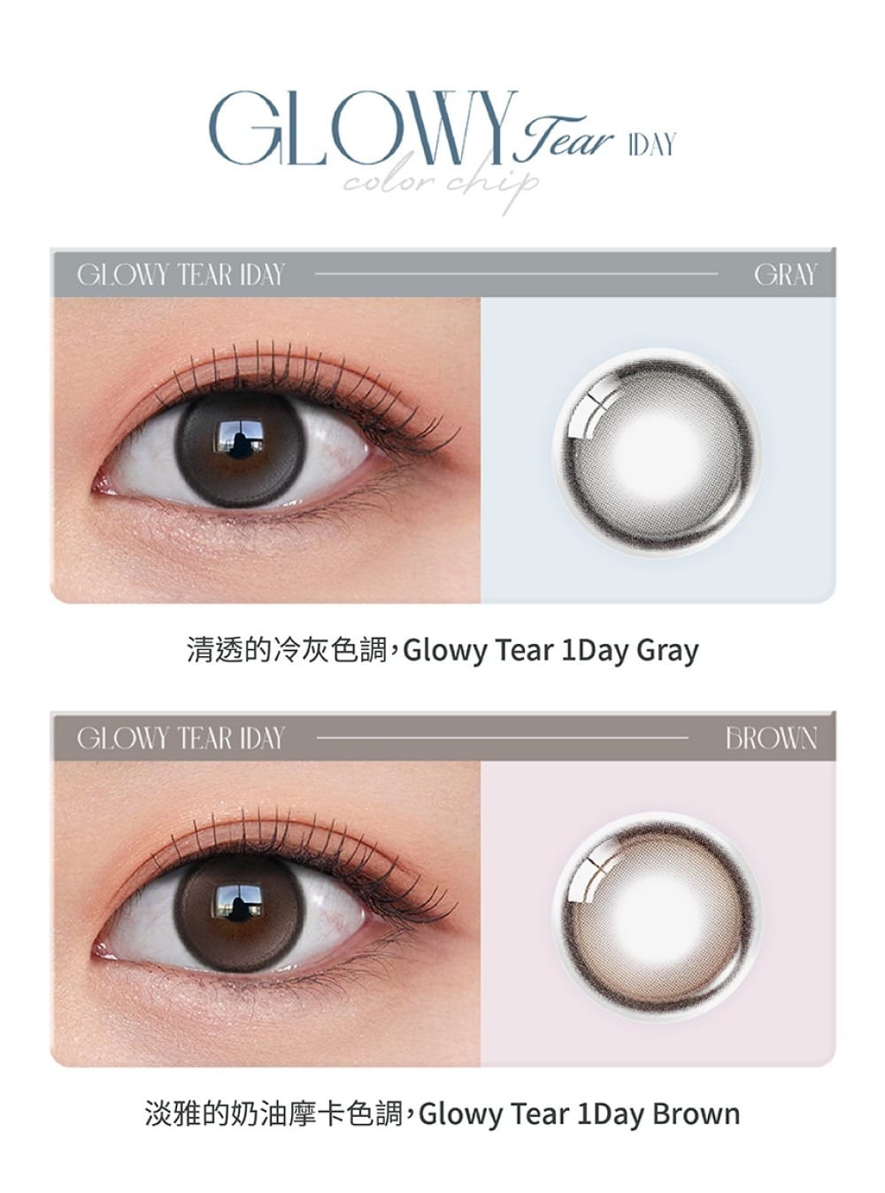 韓國美瞳 Olens Glowy Tear 1 Day 每日即棄彩色隱形眼鏡,著色直徑是 13.3mm,以柔和淡雅色調打造露珠般晶瑩眼神,雙重高光花紋設計讓雙眸如閃爍淚光般水潤動人。,系列共有兩款顏色!《此為預購品》訂貨期約 7 -14 個工作天(不含假日)